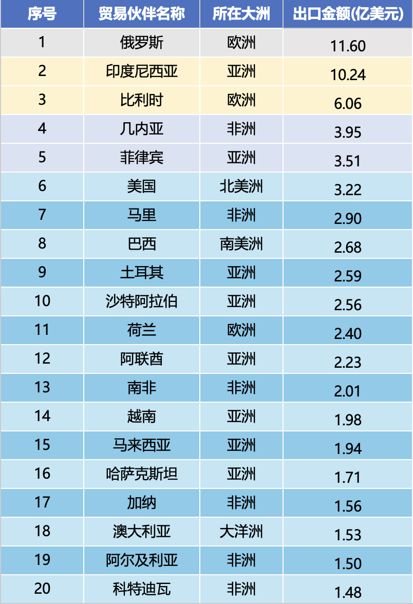 Tammi-joulukuun 2025 viennin arvojärjestyksen mukaan kymmenen suurinta kauppakumppania ovat Venäjä (1,16 miljardia dollaria), Indonesia (1,024 miljardia dollaria), Belgia (606 miljoonaa dollaria), Guinea (395 miljoonaa dollaria), Filippiinit (351 miljoonaa dollaria), Yhdysvallat (322 miljoonaa dollaria), Mali (290 miljoonaa dollaria), Brasilia (5 miljoonaa dollaria), Saudi-2 miljoonaa dollaria, Türkiye (268 miljoonaa dollaria). (256 miljoonaa dollaria). Kymmenen suurimman markkinoiden kokonaisviennin arvo nousi 4,93 miljardiin Yhdysvaltain dollariin, mikä on 45,9 % viennin kokonaisarvosta, ja keskittyminen oli korkea ydinmarkkinoilla.