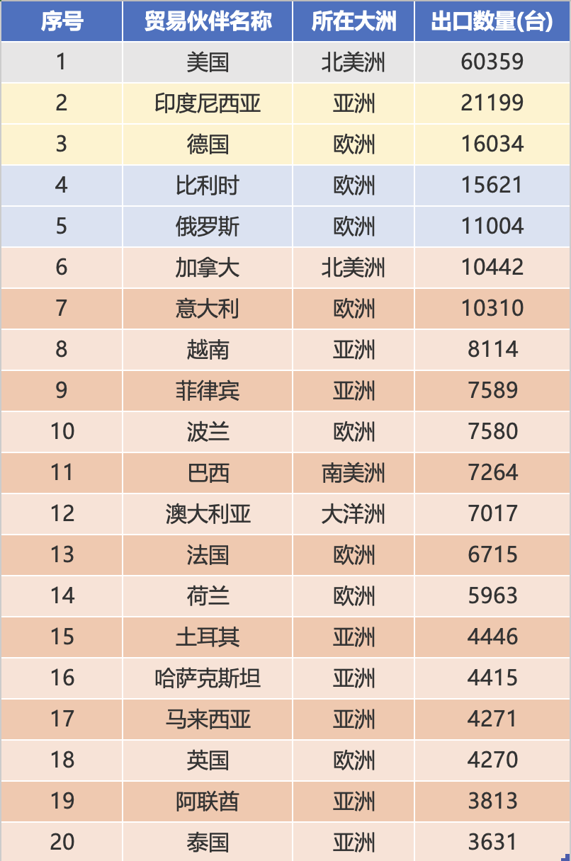 Vientimäärien luokituksen mukaan tammi-joulukuussa 2025 kymmenen suurinta kauppakumppania ovat Yhdysvallat (60 359 yksikköä), Indonesia (21 199 yksikköä), Saksa (16 034 yksikköä), Belgia (15 621 yksikköä), Venäjä (11 004 yksikköä), Kanada (10 442 yksikköä), Filippiinit 9 yksikköä, 8 yksikköä, Italia (1 yksikköä 8 yksikköä). ja Puola (7580 yksikköä). Kymmenen suurimman markkinoiden kokonaisvientimäärä oli 168 000 yksikköä, mikä on 53,1 % viennin kokonaismäärästä, mikä korostaa mittakaavavaikutusta.