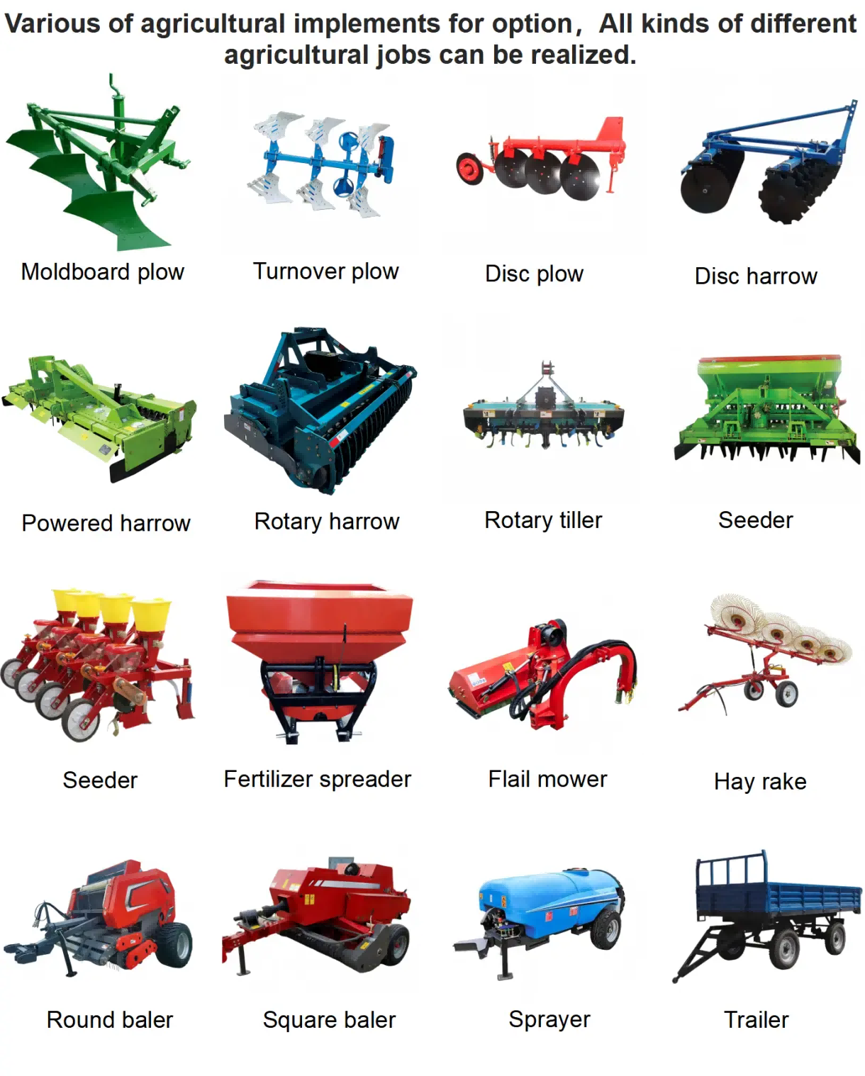 Nykyaikaisessa maataloustuotantojärjestelmässä traktorit ydinvoimalaitteina voivat saavuttaa täyden potentiaalinsa vain tieteellisesti ja asianmukaisesti yhteensovittamalla oheislaitteet.maataloustyökalut. Todelliset tuotantotarpeet vastaavat maataloustyökalut voivat paitsi parantaa merkittävästi koko viljely-, kylvö- ja pellonhoitoprosessin tehokkuutta, myös vähentää energiankulutusta ja laitteiden kulumista ja tuottaa näin viljelijöille parempia voittoja.